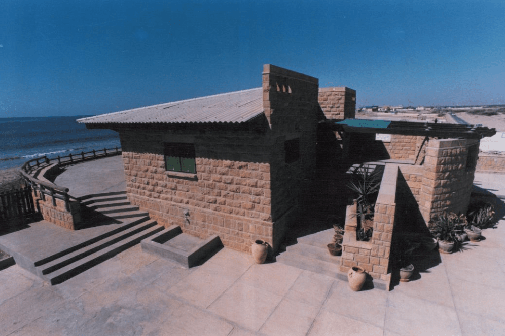 The beach hut is constructed with stone walls and a wooden sloping roof, harmonizing with the natural coastal environment. The design centers around a hierarchical spatial arrangement, beginning with a courtyard at the entrance. This courtyard features openings in the walls that frame picturesque views of the mangroves along the roadside. On the left side of the entrance, the lounge offers expansive views of the sea through large windows, complemented by a spacious terrace where guests can sit outside and relax.