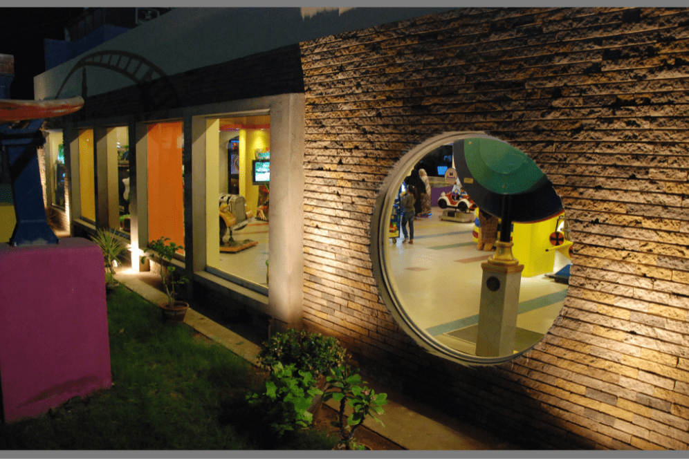 The façade features a dynamic mix of textures and finishes, with textured wall cladding complemented by sleek cement-finish pavers for a modern touch. A thoughtfully designed entrance provides a warm and inviting introduction to the amusement zone